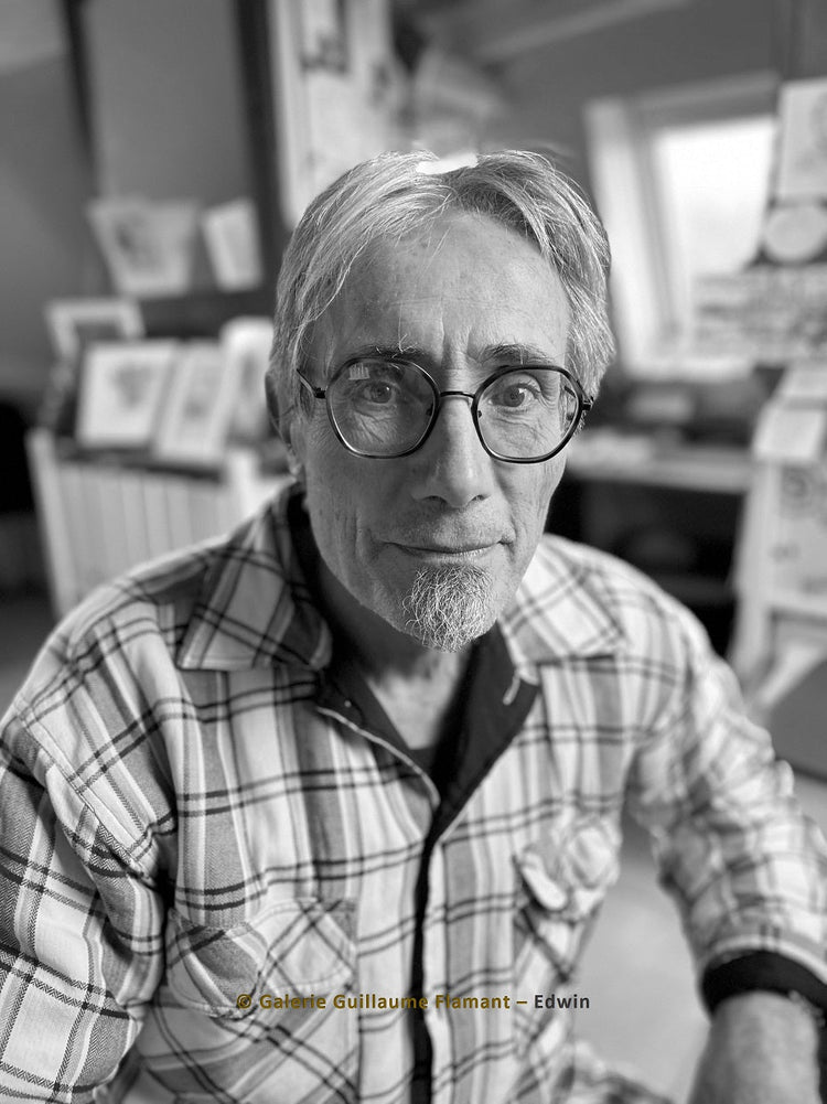 À l’origine dessinateur de presse (L’Huma', Révolution, Jazz-Magazine, Griffon), Edwin découvre la gravure à Étampes puis à l'atelier Circé (Paris 13), s’initie à la gravure/édition à l'ESAA Duperré puis « accoste » à l'Atelier aux Lilas où il amarre durablement pointes sèches, burin et autres brunissoirs.