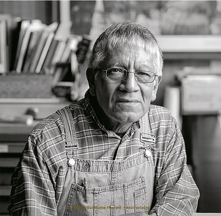 Raúl Velasco is an artist steeped in the popular printmaking tradition of his homeland, Mexico. He dares to defend the idea of popular art accessible to all, which requires a certain courage in a city like Paris... In his work, self-mockery rhymes with eroticism, and social awareness with inventive technical processes. For in each etching, he invents a method: plates cut and superimposed or welded together for a single pass, etchings assembled with wooden plates - anything goes, as long as it passes under the press.