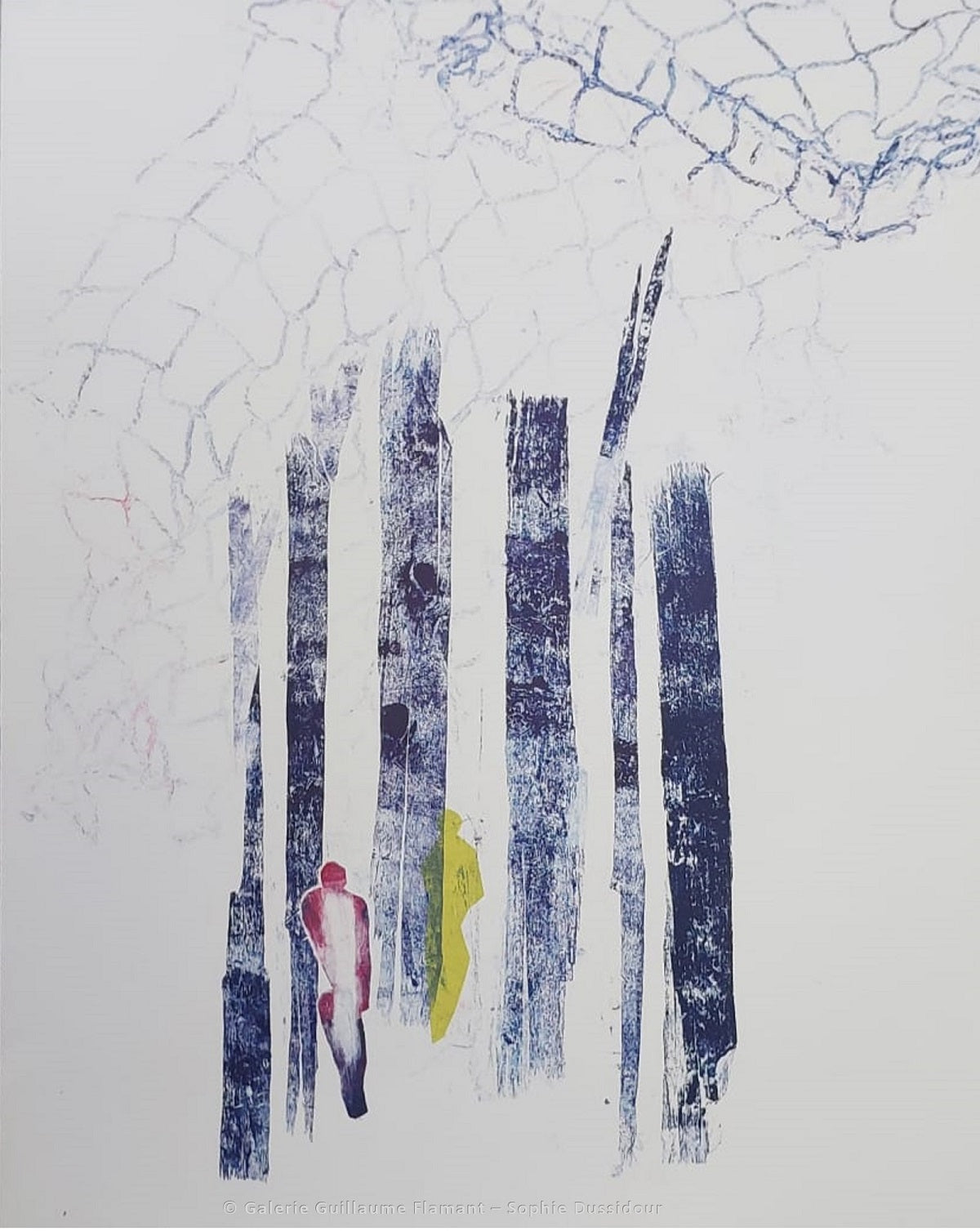 Monotipo di Sophie Dussidour. Incisione su tecnica mista, corda, rhenalon, piante.