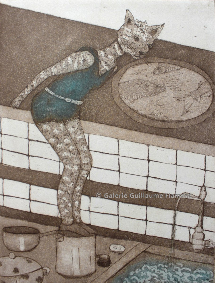 Une gravure sportive appartenant à une série autour du sport ménager, où les activités du quotidien deviennent des sports de compétition, et où les sports de compétition utilisent des outils domestiques - et où les femmes, de tous poils, sont les plus grandes des athlètes. Ici, la plonge rencontre le plongeon.